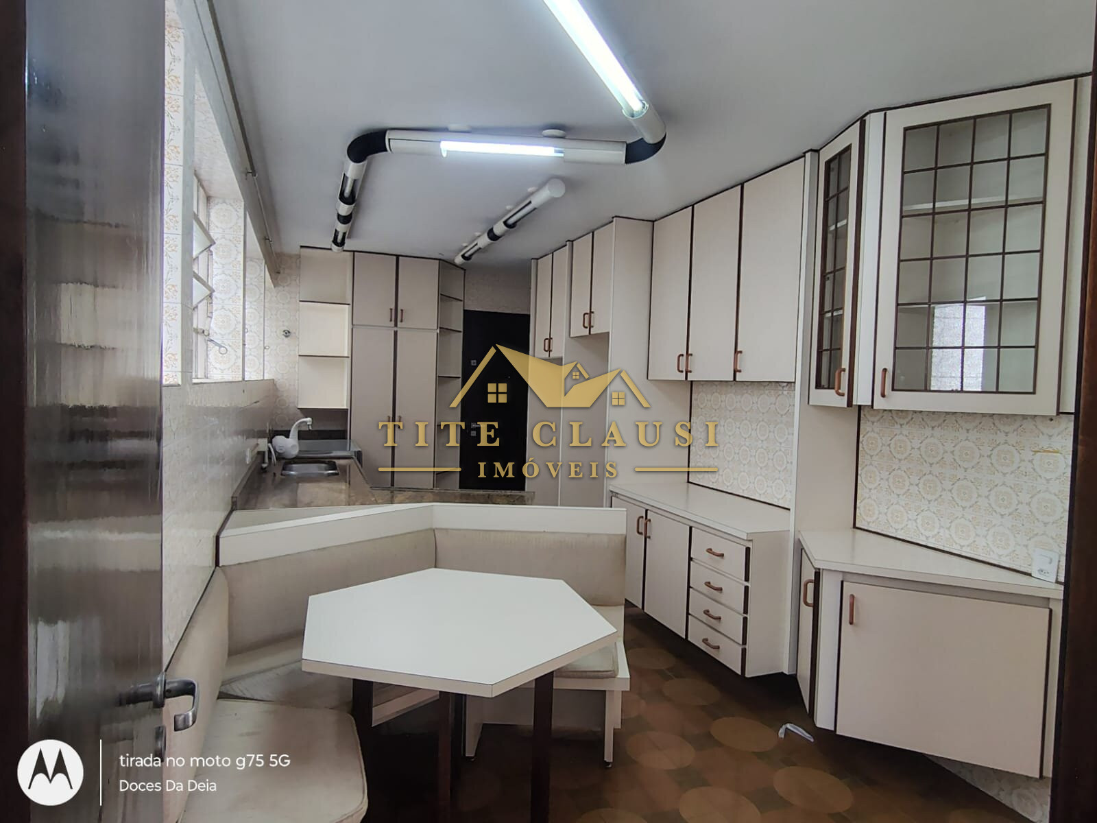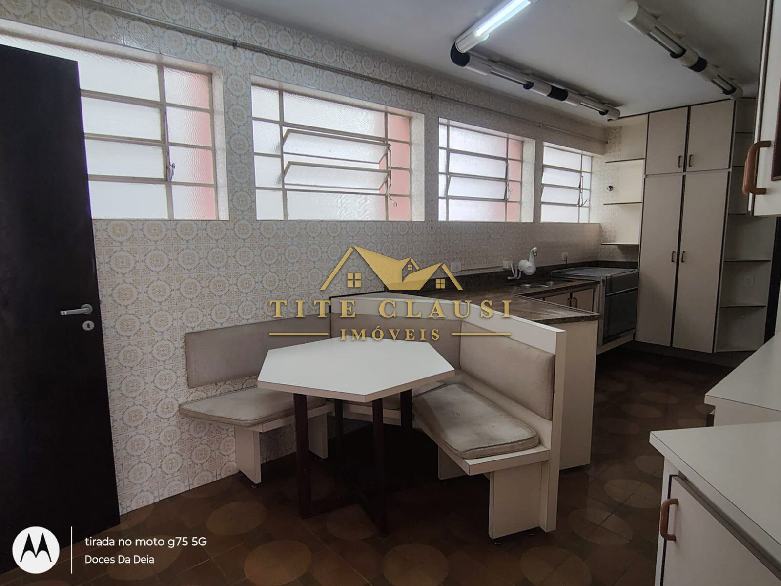 1 cozinha com móveis fixos, canto alemão e tampos em granito.