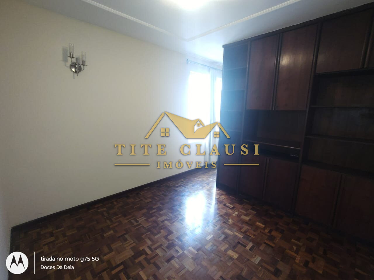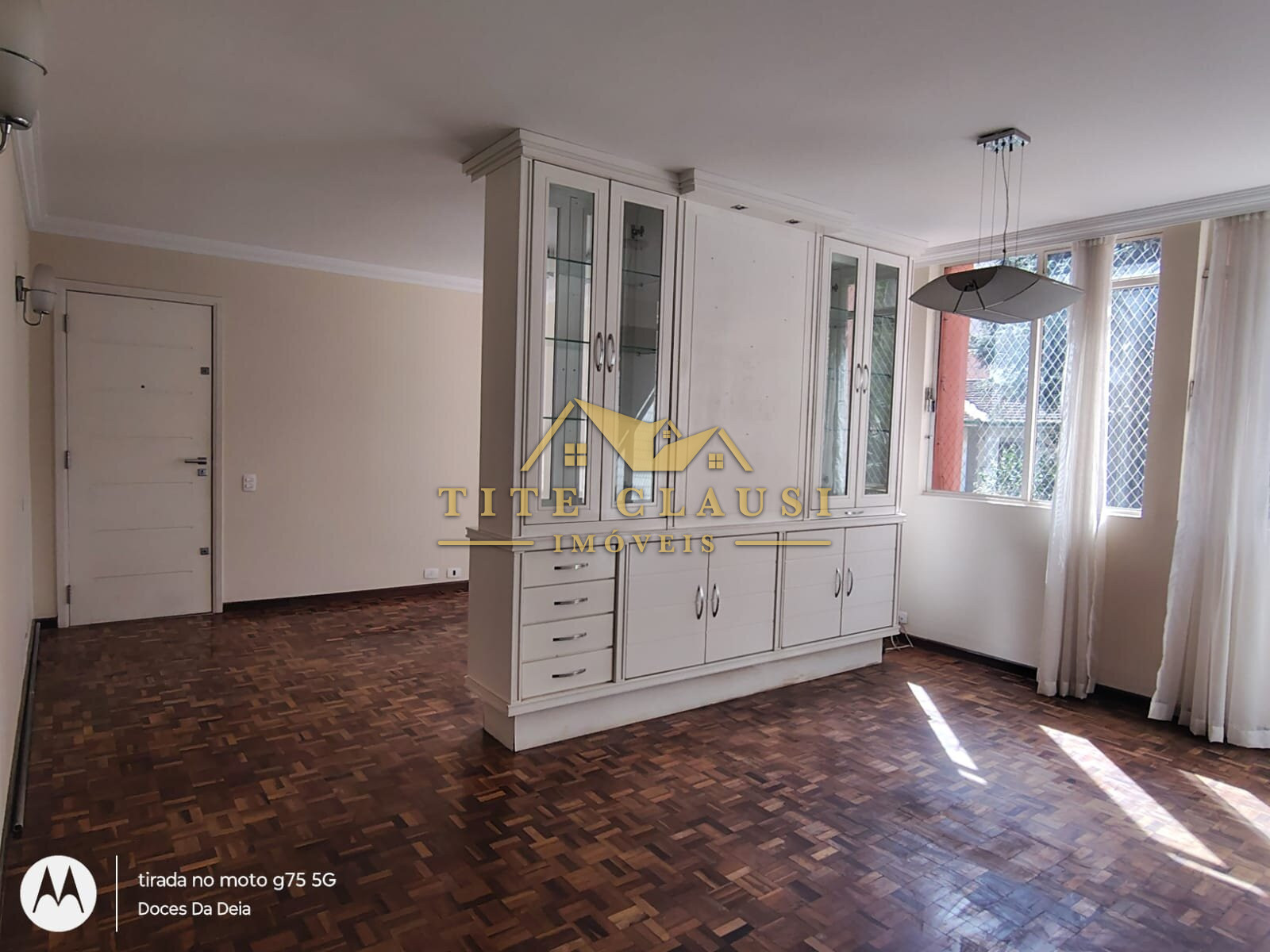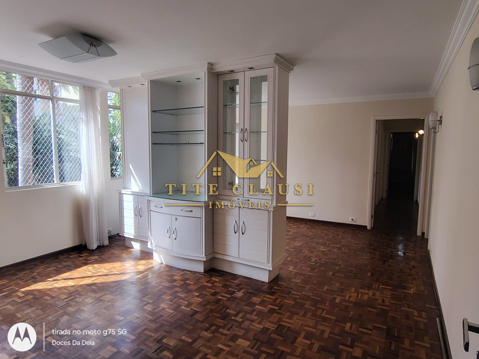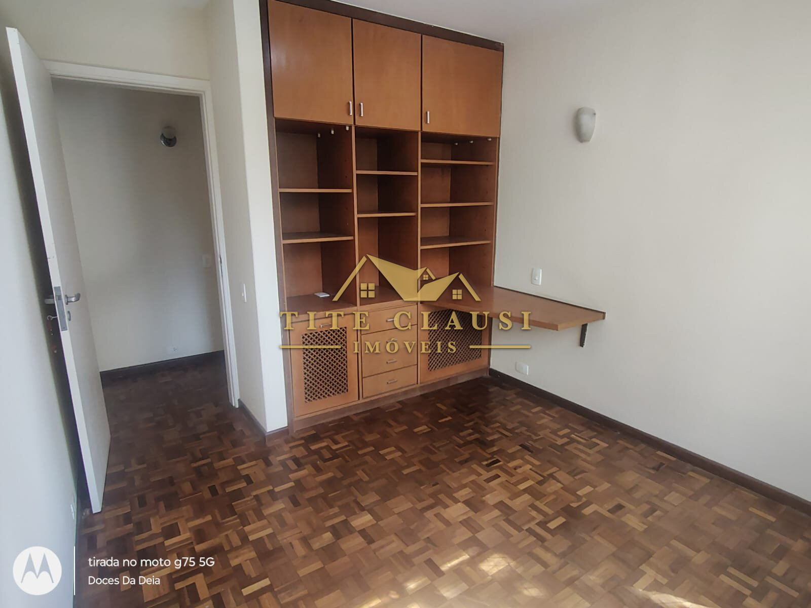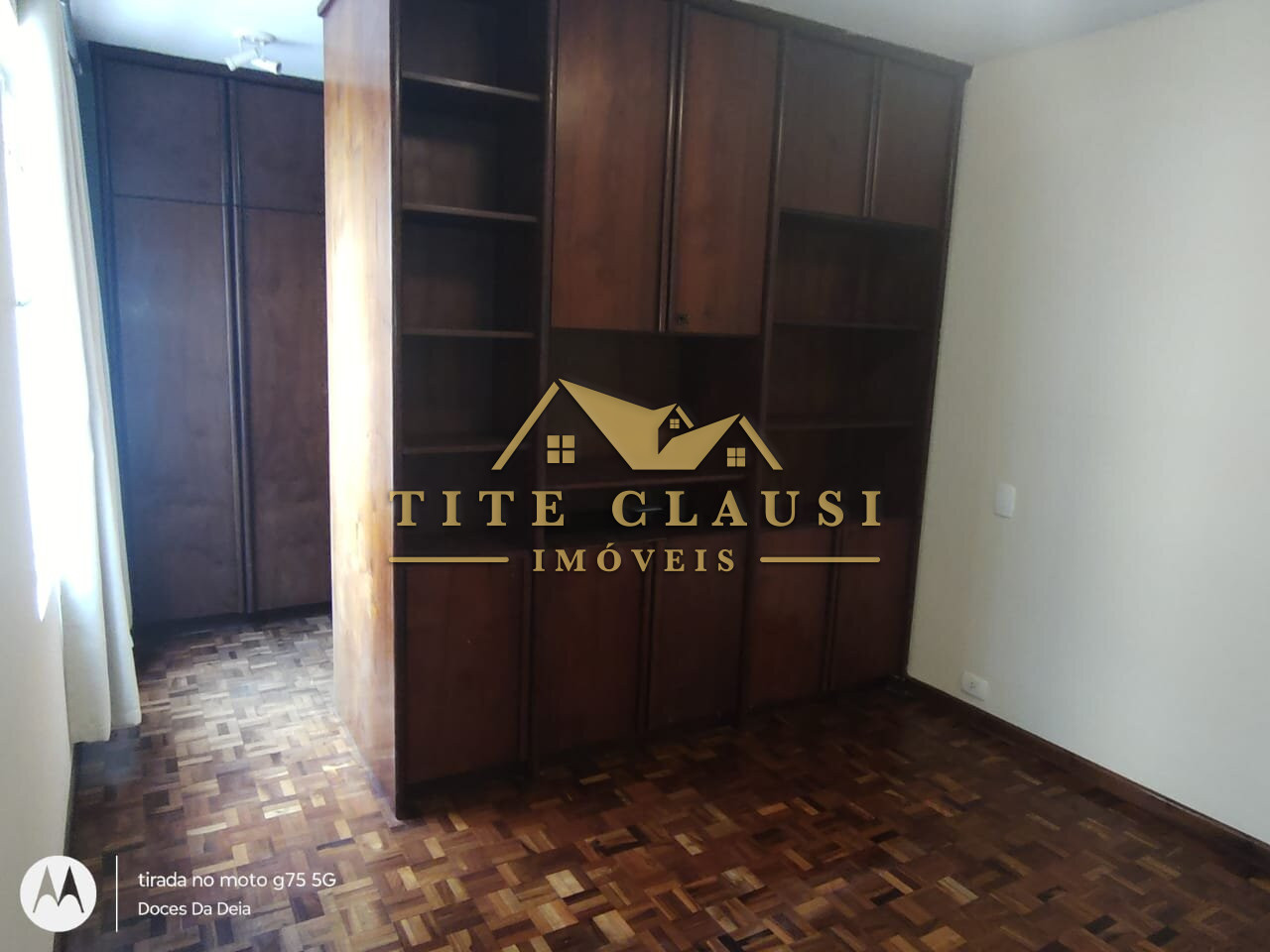 1 sala ampla com iluminação natural, armário fixo e piso em parquet.