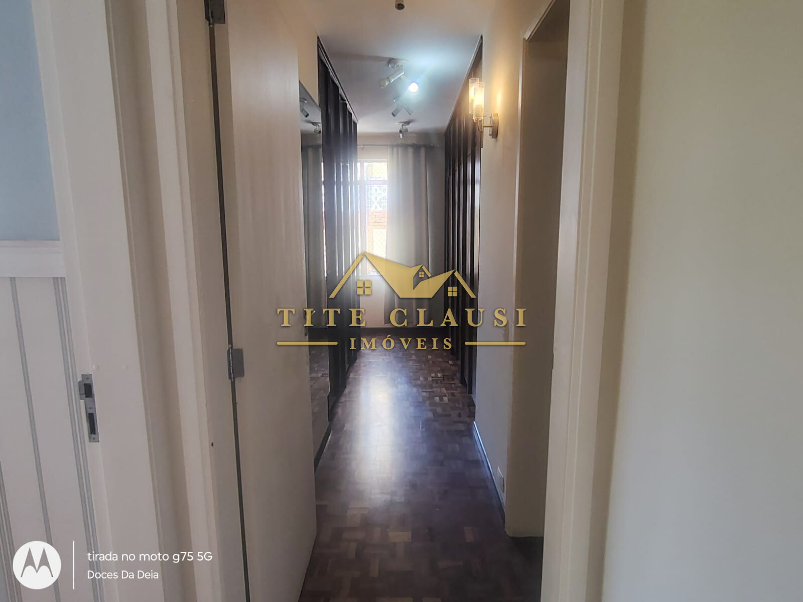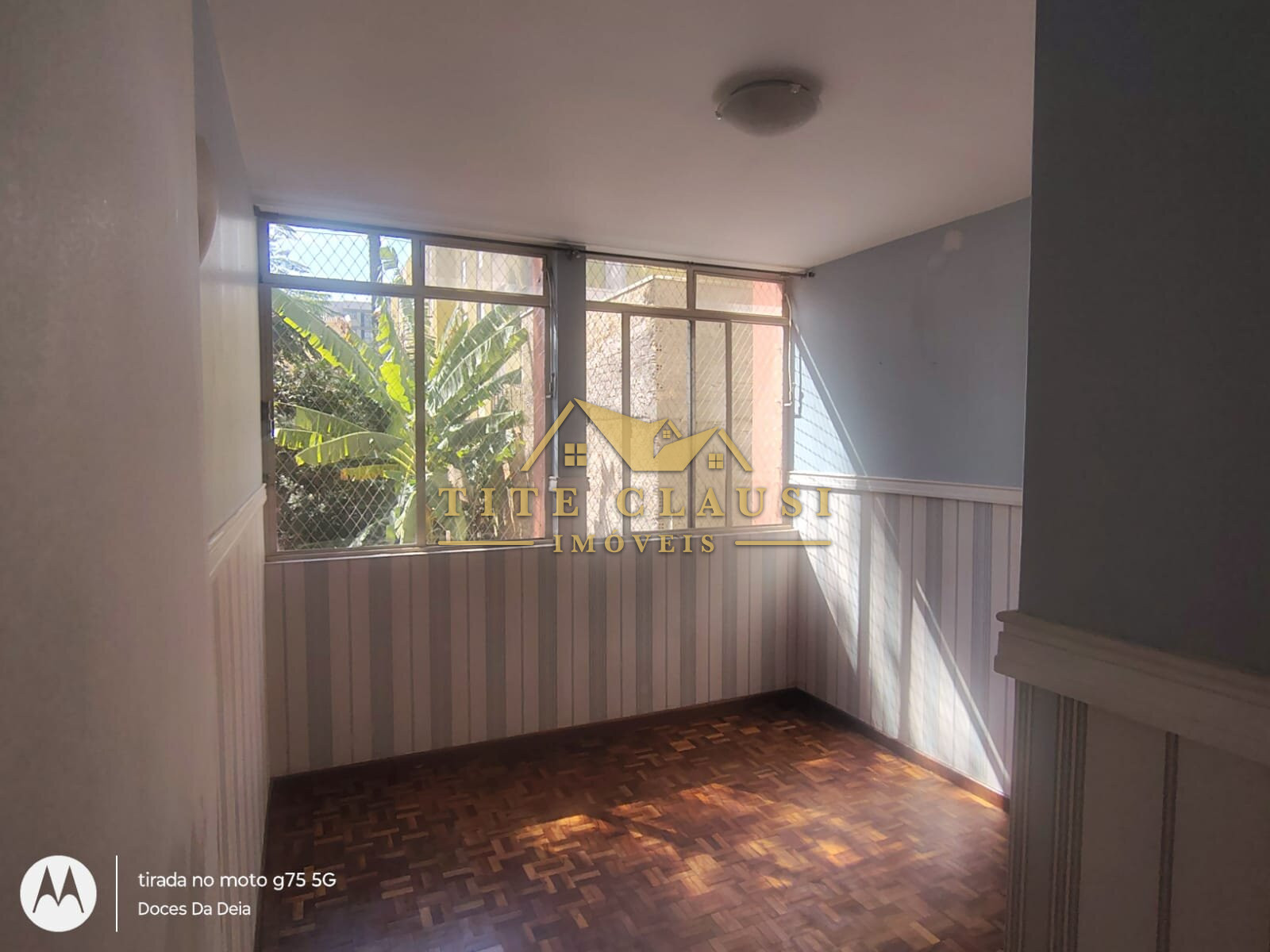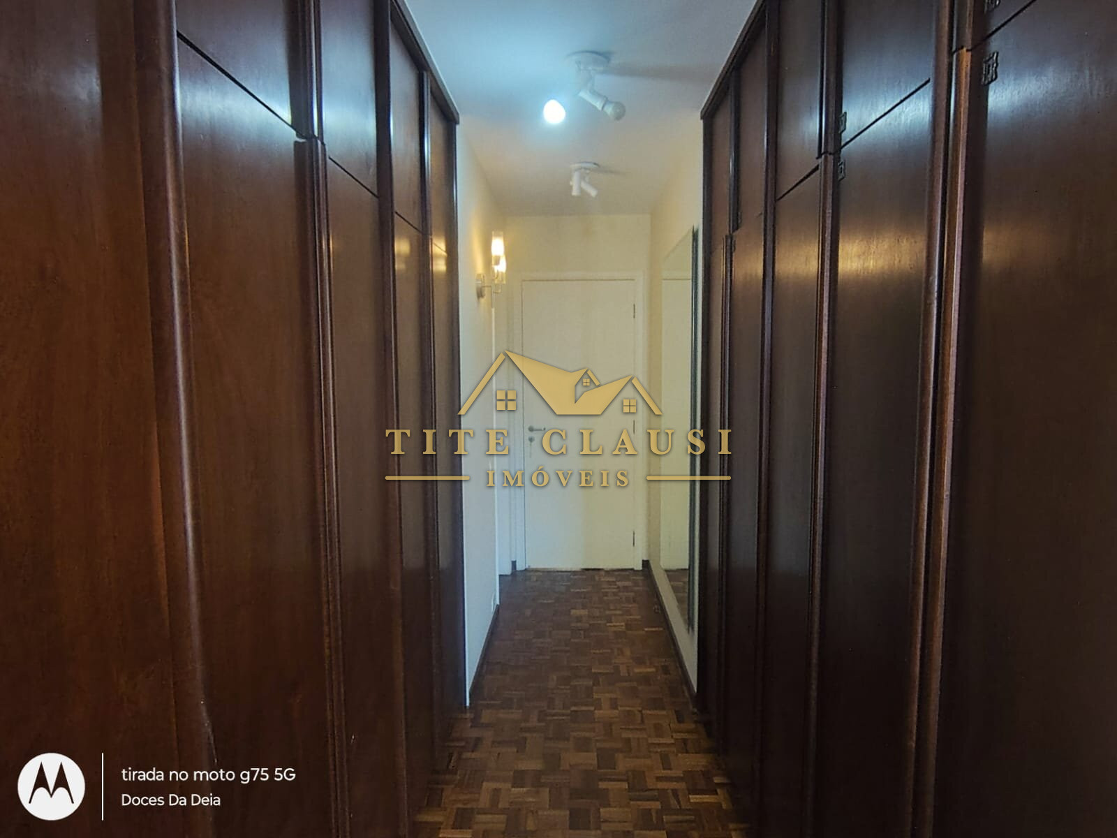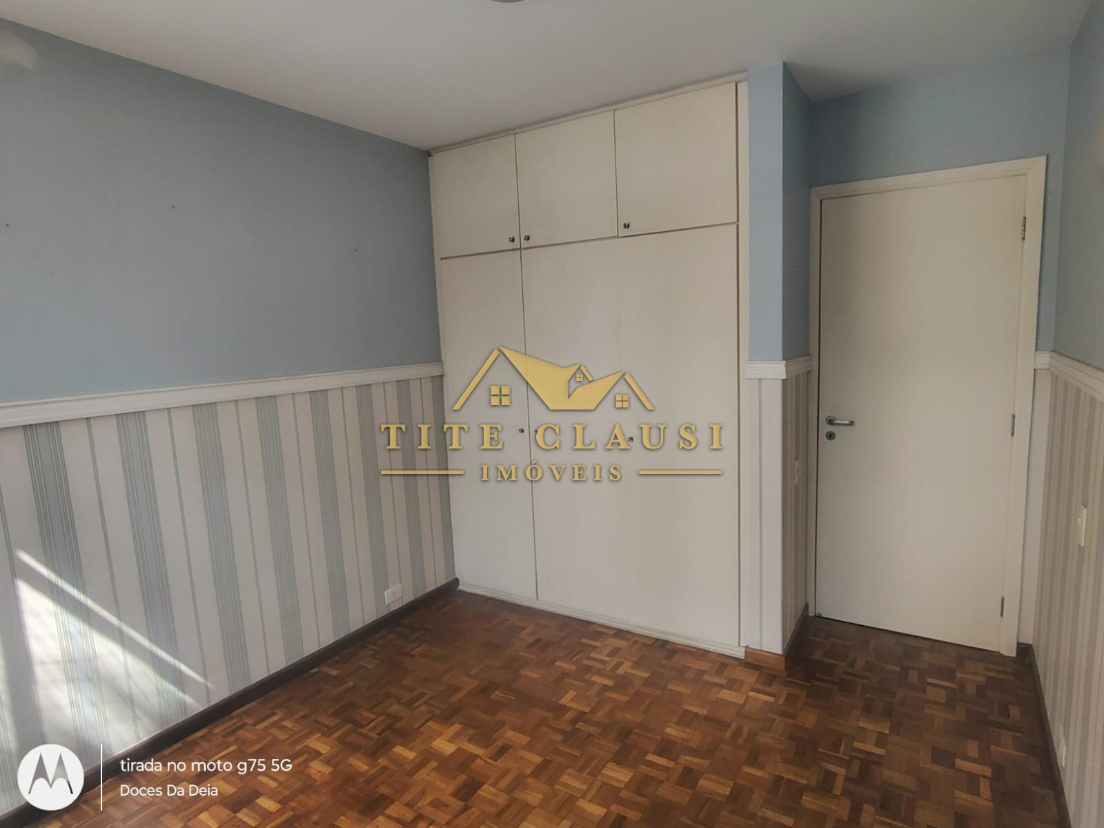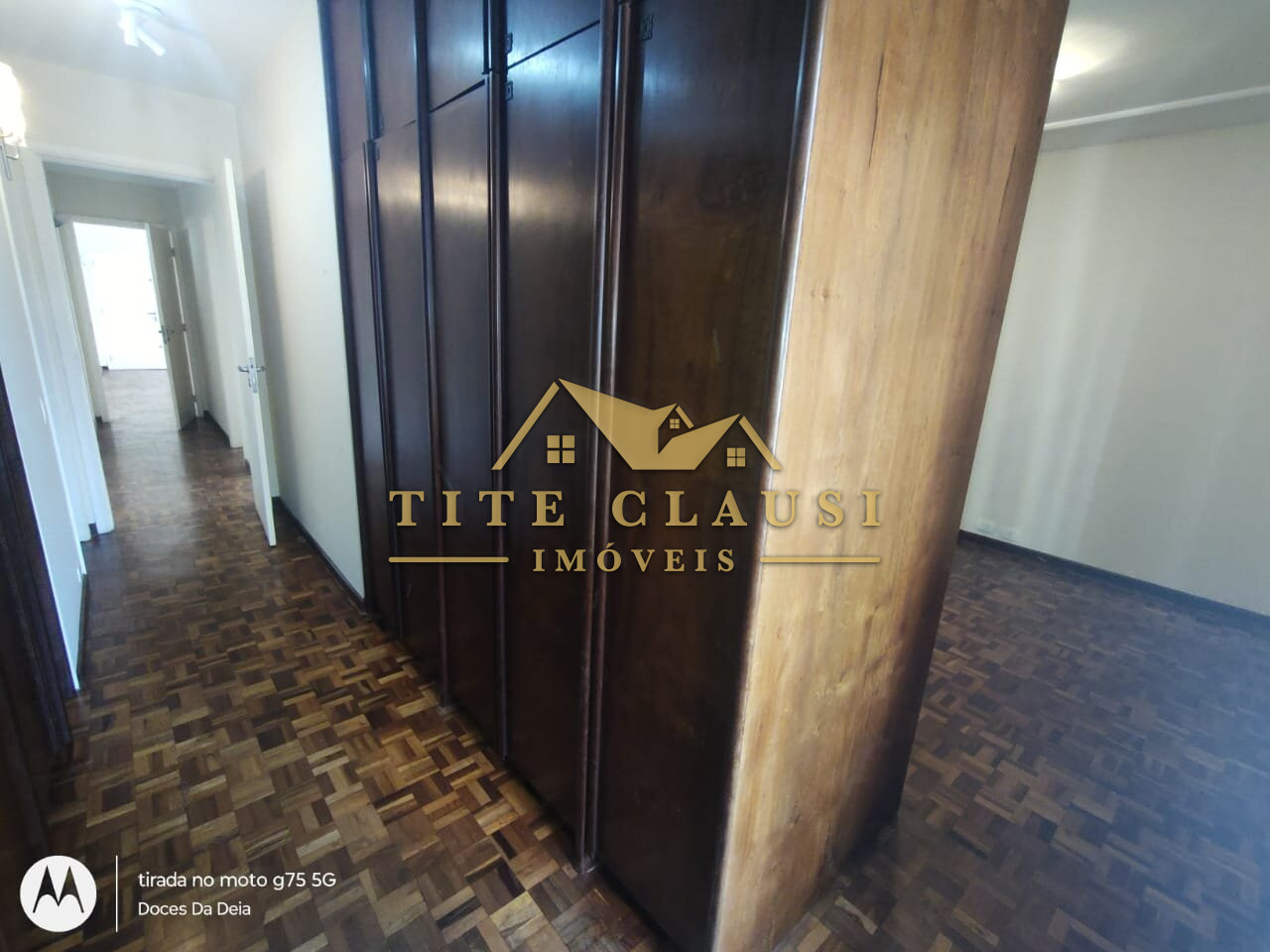 1 sala ampla com iluminação natural, armário fixo e piso em parquet.