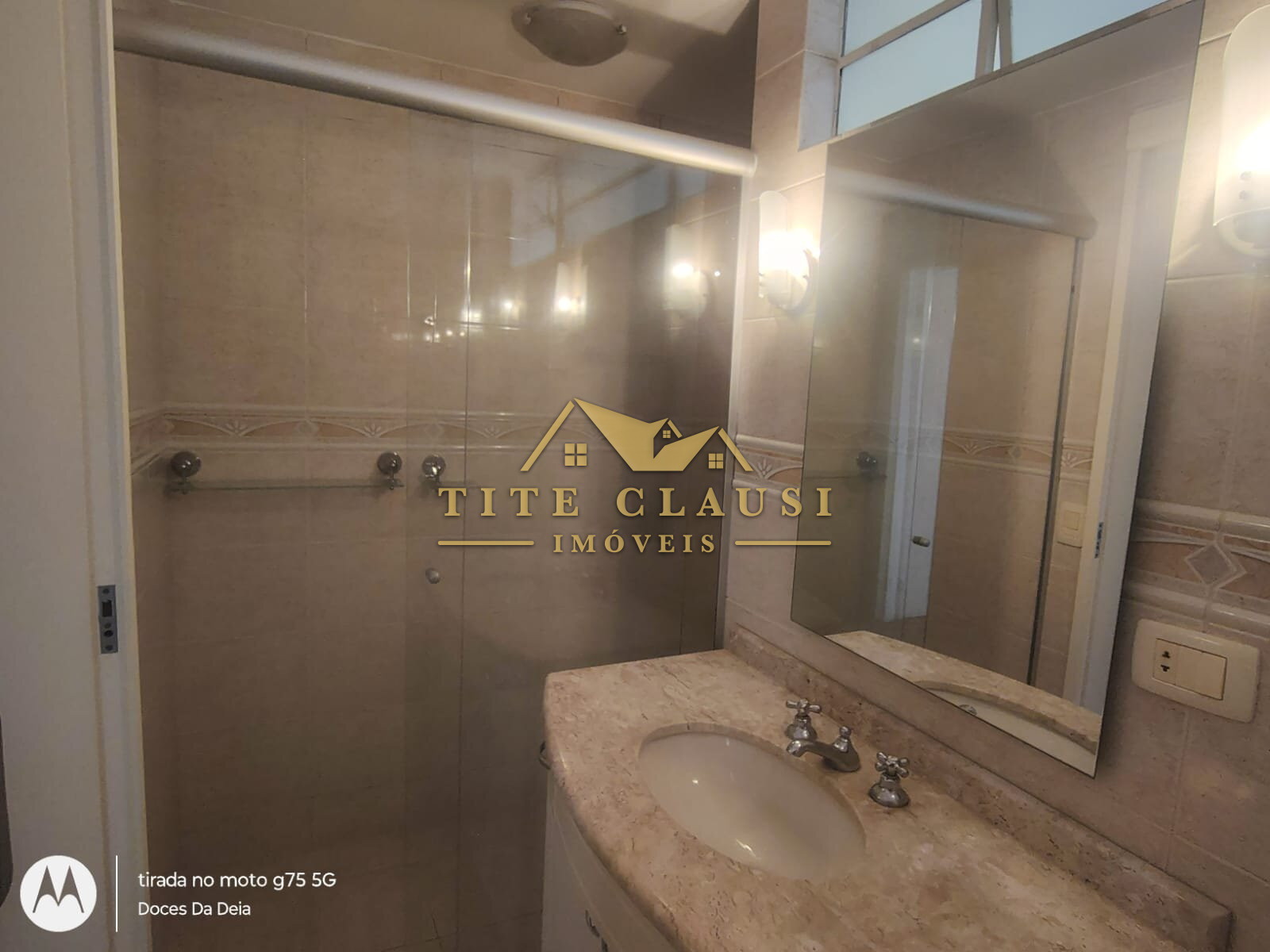 1 banheiro social com pia em mármore e box em vidro.