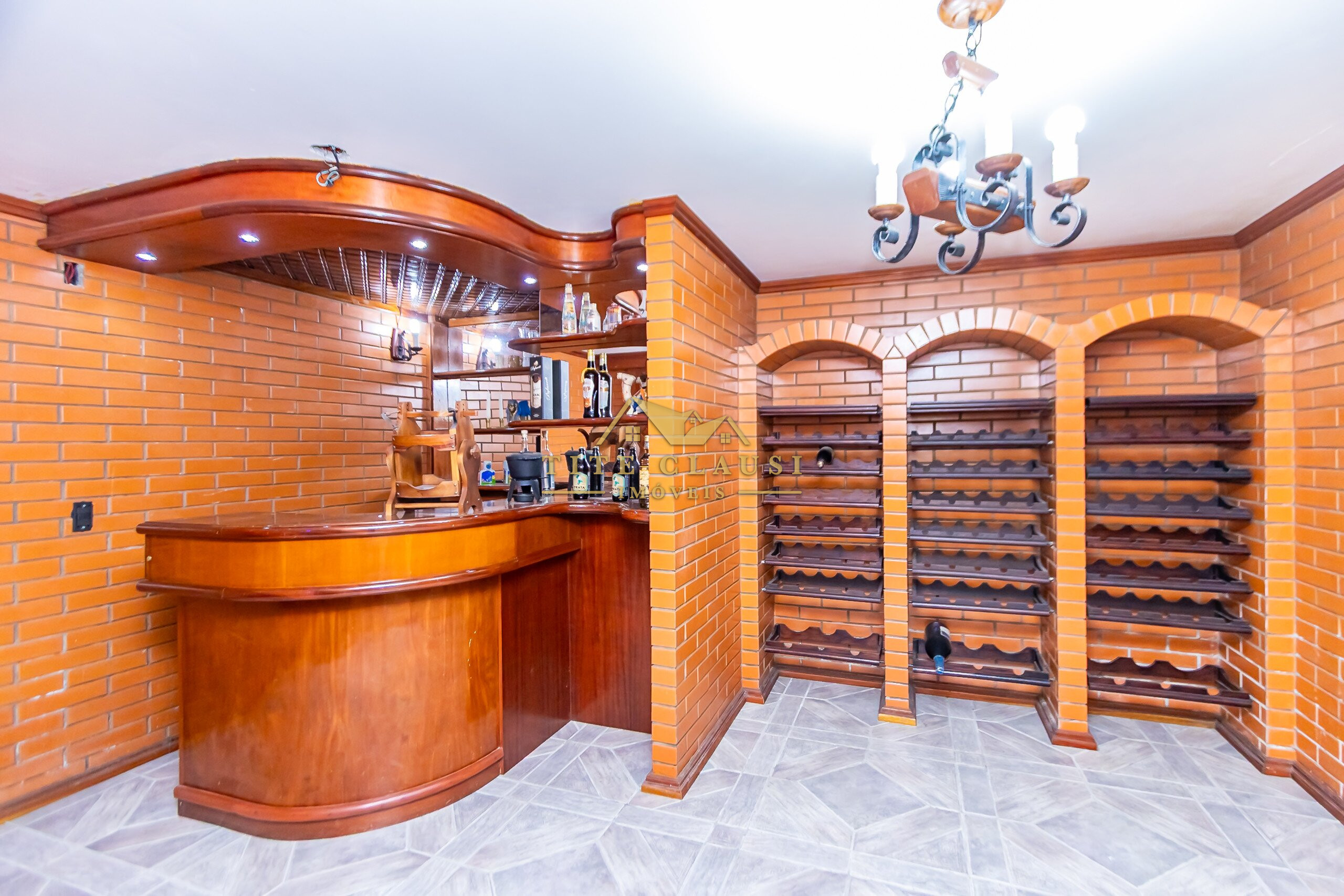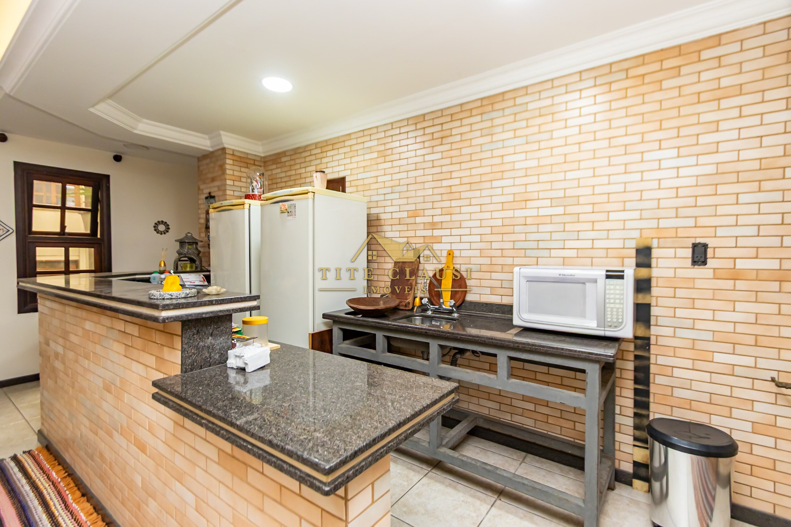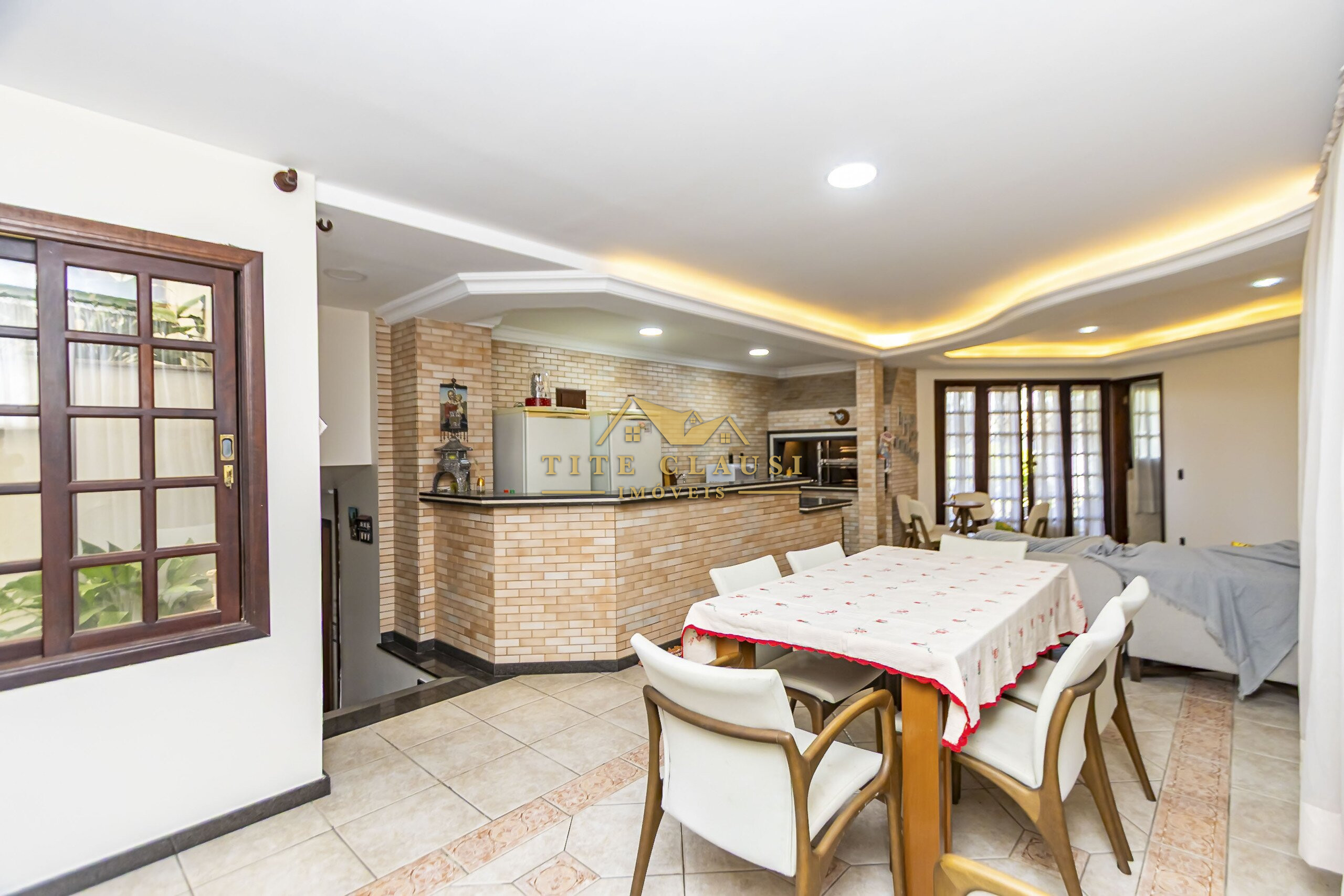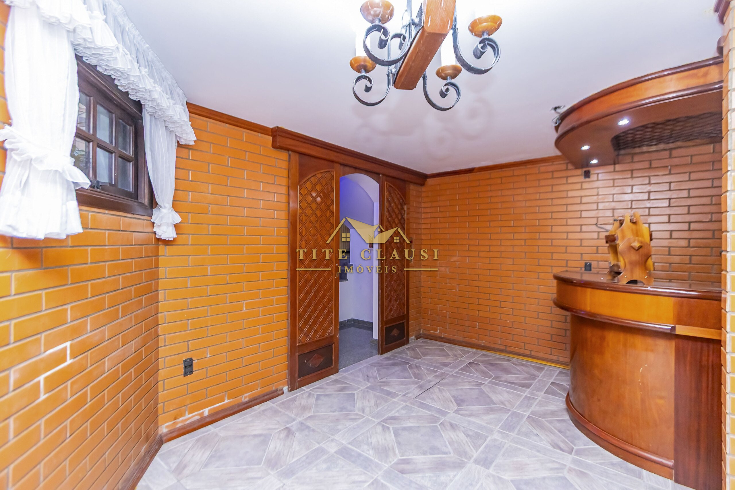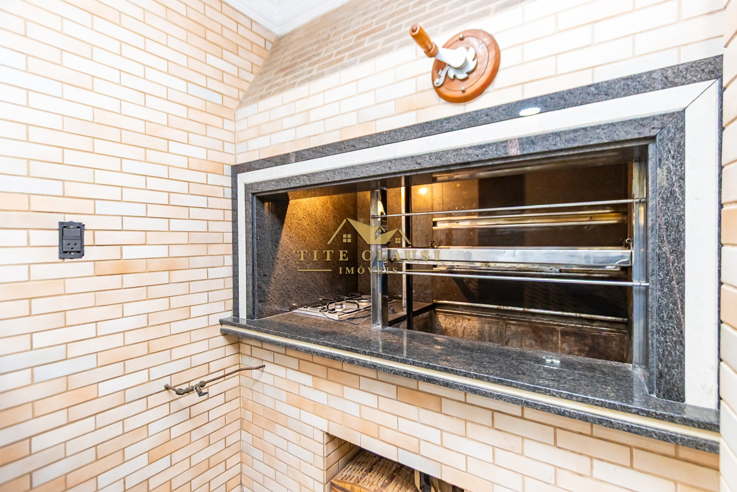 Primeiro pavimento: Ampla sala de TV com lareira. Salão com churrasqueira à carvão com grelha móvel e fogão à gás, bancada com armários e pia. Acesso direto para a cozinha. Banheiro grande com fácil acesso ao jardim dos fundos.